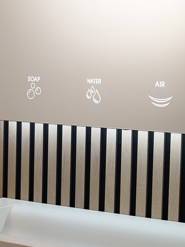 BTM e un sistema di lavaggio e asciugatura delle mani integrato dietro lo specchio con rilevamento automatico per un risparmio di risorse. Facili da installare, i moduli sono regolabili e segnalati da pittogrammi a LED per un utilizzo intuitivo. Ottenete bagni minimalisti, igienici e organizzati con il BTM.